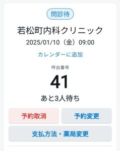 呼出番号の下の数字がご自身の呼び出し番号です。あと◯人の部分がご自身の呼び出しまでにお待ちの人数です。この人数が5人以下になってからクリニックへお越しください。