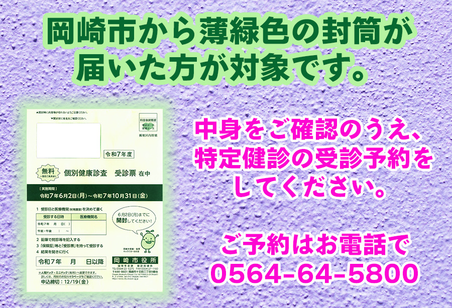 岡崎市から受診票を受け取り、お手元にお持ちの方は無料で受診が可能です。